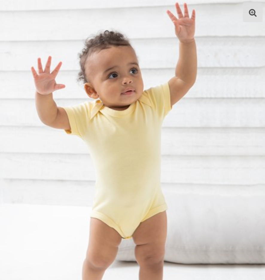 Super soft baby bodysuit with envelope style neckline, binding at edges for shape retention and nickel-free poppers at legs for ease of dressing