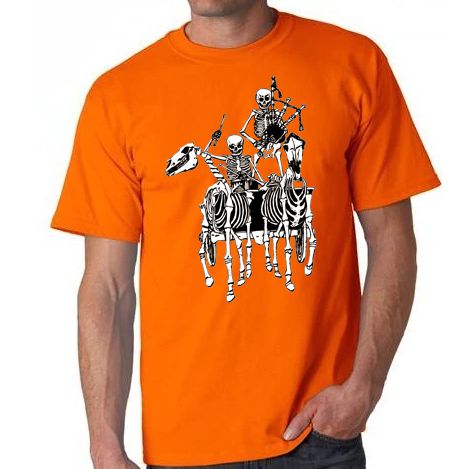 Gildan T-shirt with with East Riding Pipe Band skeletons printed large on the front. You can also have printed text added to the back of the top.