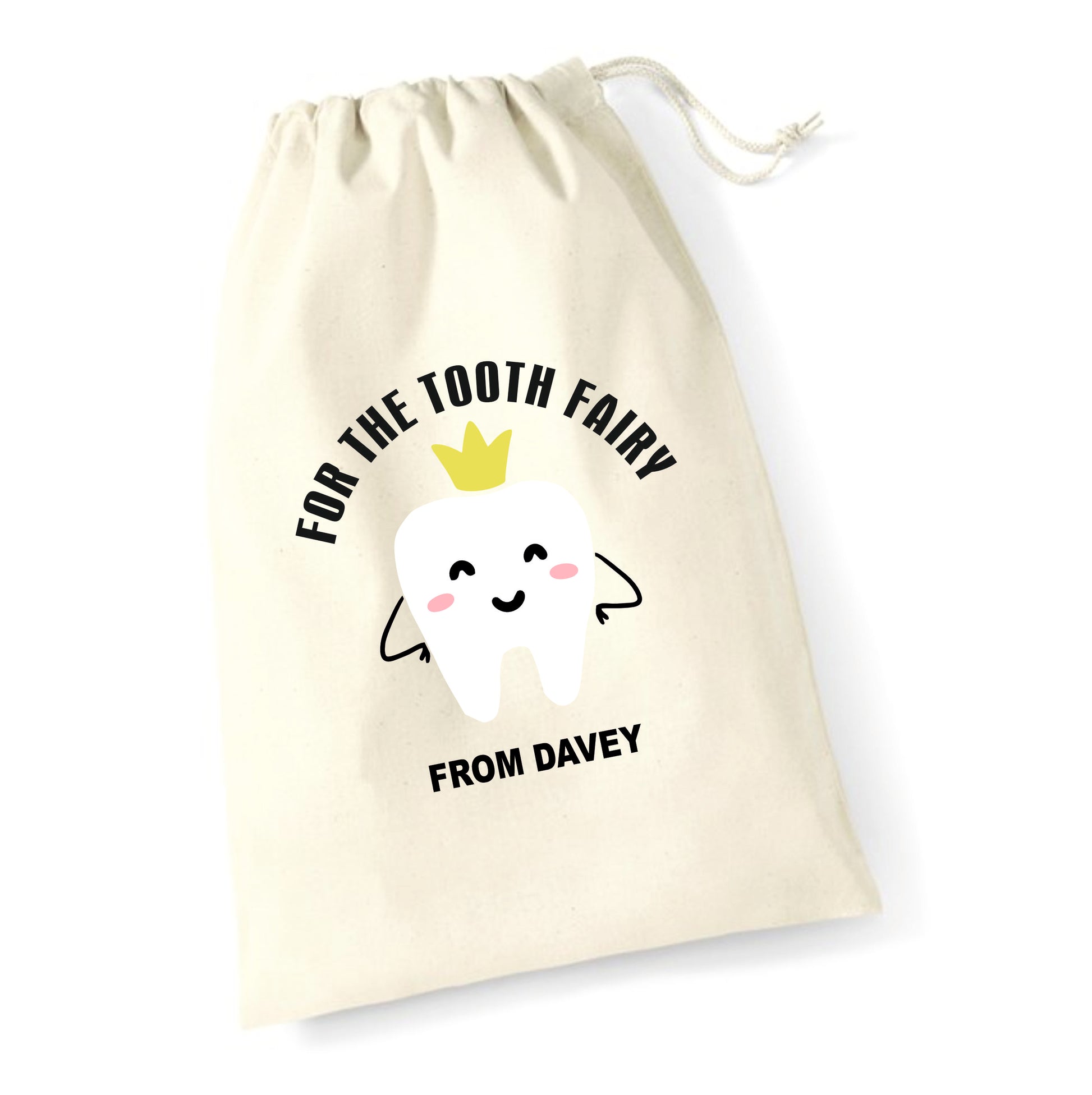 A safe place to leave your child's tooth awaiting a visit from the tooth fairy. Made from recycled cotton this bag features a handy drawstring to allow your child to hang the bag up or pop it safe under their pillow. With a chose of 4 different designs and the ability to personalise this bag with your child's name.